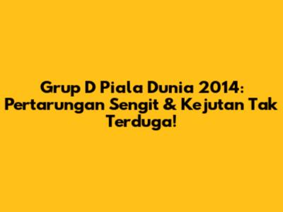 Grup D di Piala Dunia 2014 adalah salah satu grup yang paling menarik. Pertarungan sengit, kejutan tak terduga, dan kisah inspiratif membuat grup ini tak terlupakan. Kosta Rika menjadi kuda hitam yang mengejutkan dunia, sementara Uruguay menunjukkan semangat juang yang luar biasa. Italia dan Inggris harus pulang lebih awal, namun pengalaman mereka menjadi pembelajaran berharga. Piala Dunia 2014 meninggalkan kenangan indah bagi para pecinta sepak bola, dan Grup D adalah salah satu bagian yang tak terpisahkan dari kisah yang menarik ini. Jadi, jangan lupa untuk selalu mengapresiasi perjuangan para pemain, pelatih, dan tim, karena sepak bola adalah tentang semangat, kerja keras, dan persahabatan!